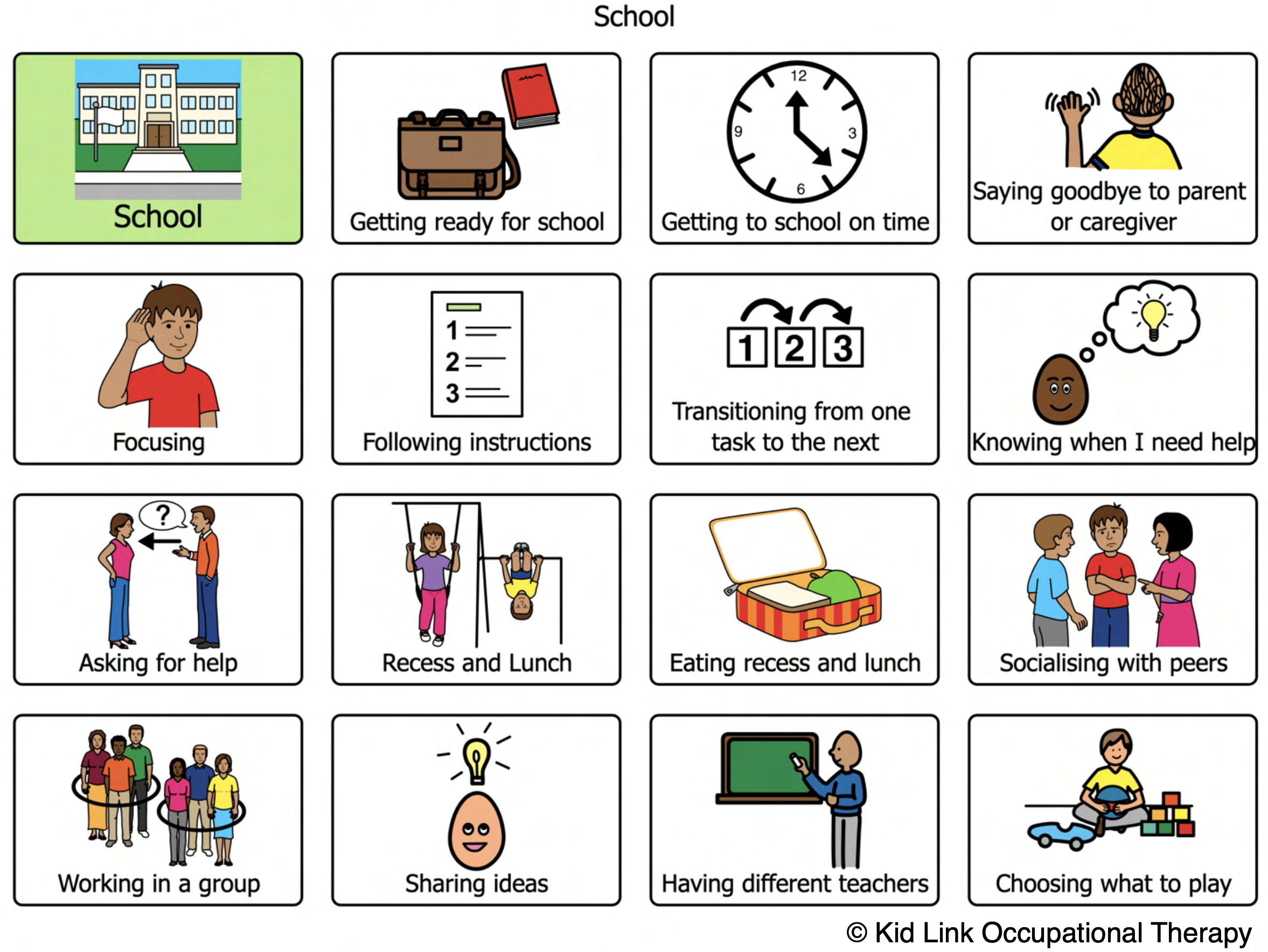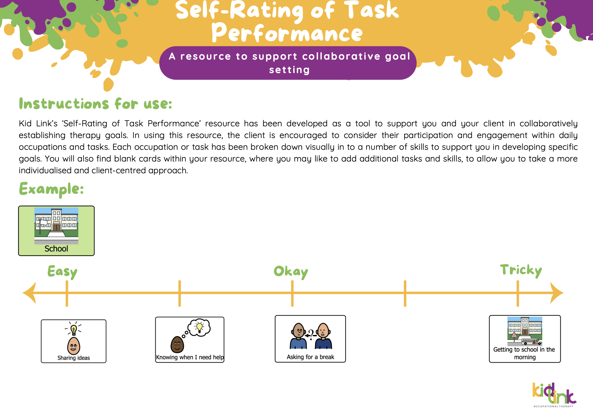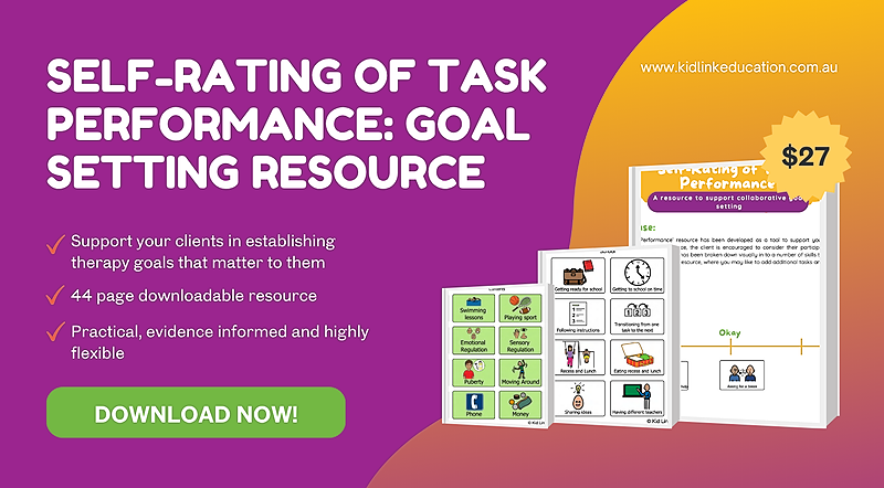 Kid Link’s ‘Self-Rating of Task Performance' resource has been developed as a tool to support you and your client in collaboratively establishing therapy goals and setting goals that are meaningful to the client themselves. In using this resource, the client is encouraged to consider their participation and engagement within a broad range of daily occupations and tasks. This 44-page download includes: - Instructions for therapists on how to implement the resource - Visual cards covering a broad range of daily tasks and occupations - Blank cards for adding personalised tasks and goals Practical, evidence-informed, and highly flexible, this resource is a client centred approach to goal setting that supports engagement, self-awareness, and meaningful progress.
